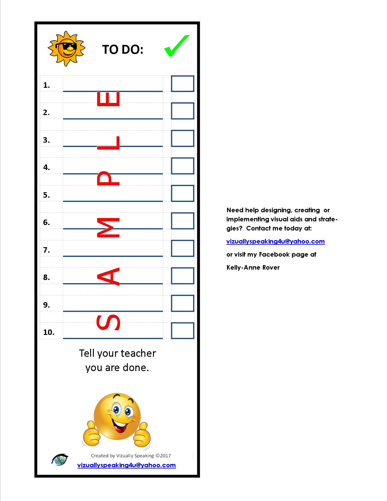 Checkbox lists: Written or visual tasks with checkboxes that can be marked, crossed off, or Velcro-removed when completed.